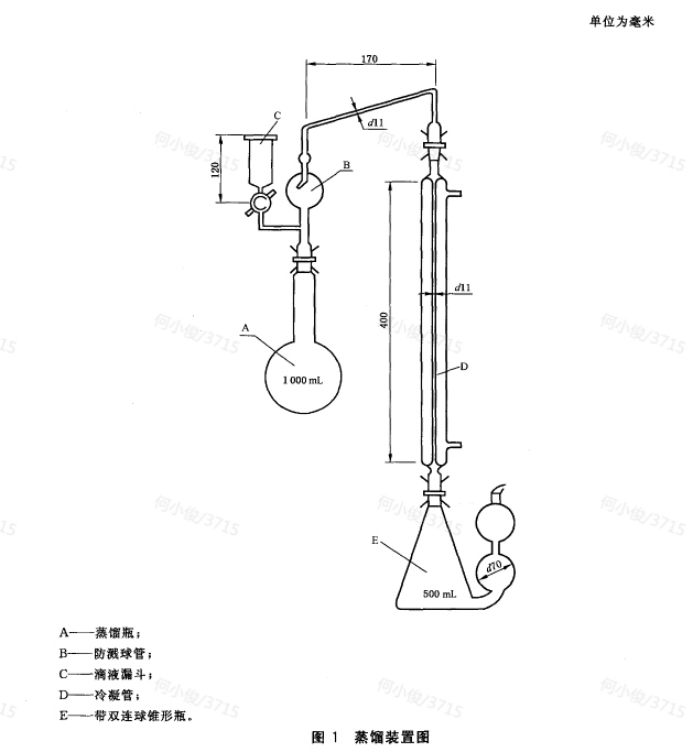 蒸餾加熱裝置:1000W~1500W電爐,置于升降臺架上,可自由調節高度。也可使用調溫電爐或能夠調節供熱強度的其他形式熱源。